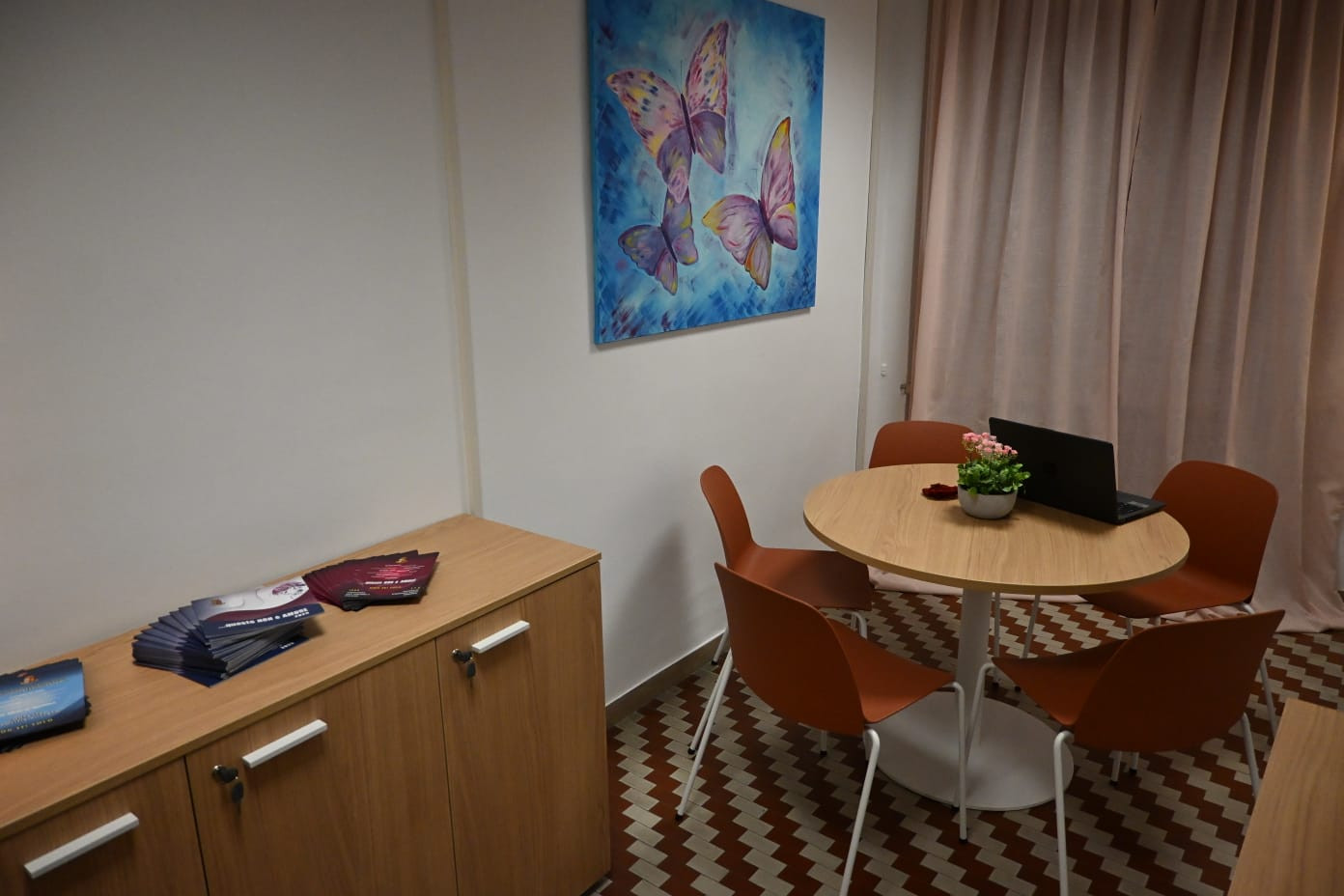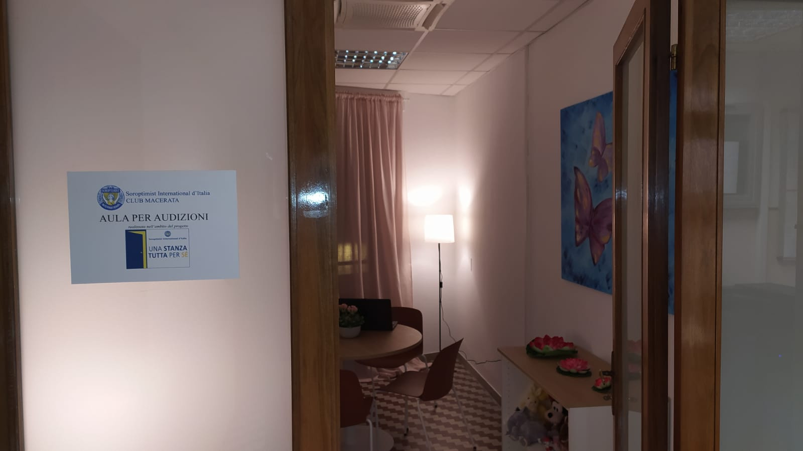 La stanza – allestita dal Soroptimist Club di Macerata – è stata ideata per ricreare un clima familiare, lontano dalla freddezza degli ambienti istituzionali. Arredi caldi, colori tenui e due quadri raffiguranti farfalle in volo, donati dalla socia Letizia Felicioli, contribuiscono a generare un senso di leggerezza e protezione. «Le farfalle – spiegano – sono il simbolo della speranza di una rinascita possibile».