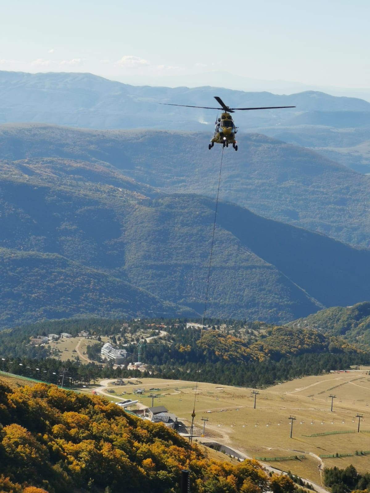 Con la posa dei primi 6 dei 19 sostegni previsti, la nuova cabinovia Frontignano-Cornaccione comincia a prendere forma a Frontignano di Ussita. L’operazione, realizzata venerdì scorso, ha visto la partecipazione di un elicottero Superpuma, impiegato sia per trasportare i pesanti sostegni — fino a 3.500 kg ciascuno — sia per rimuovere i rottami delle vecchie seggiovie e dello skilift in Val di Bove, portandoli via dalla montagna.