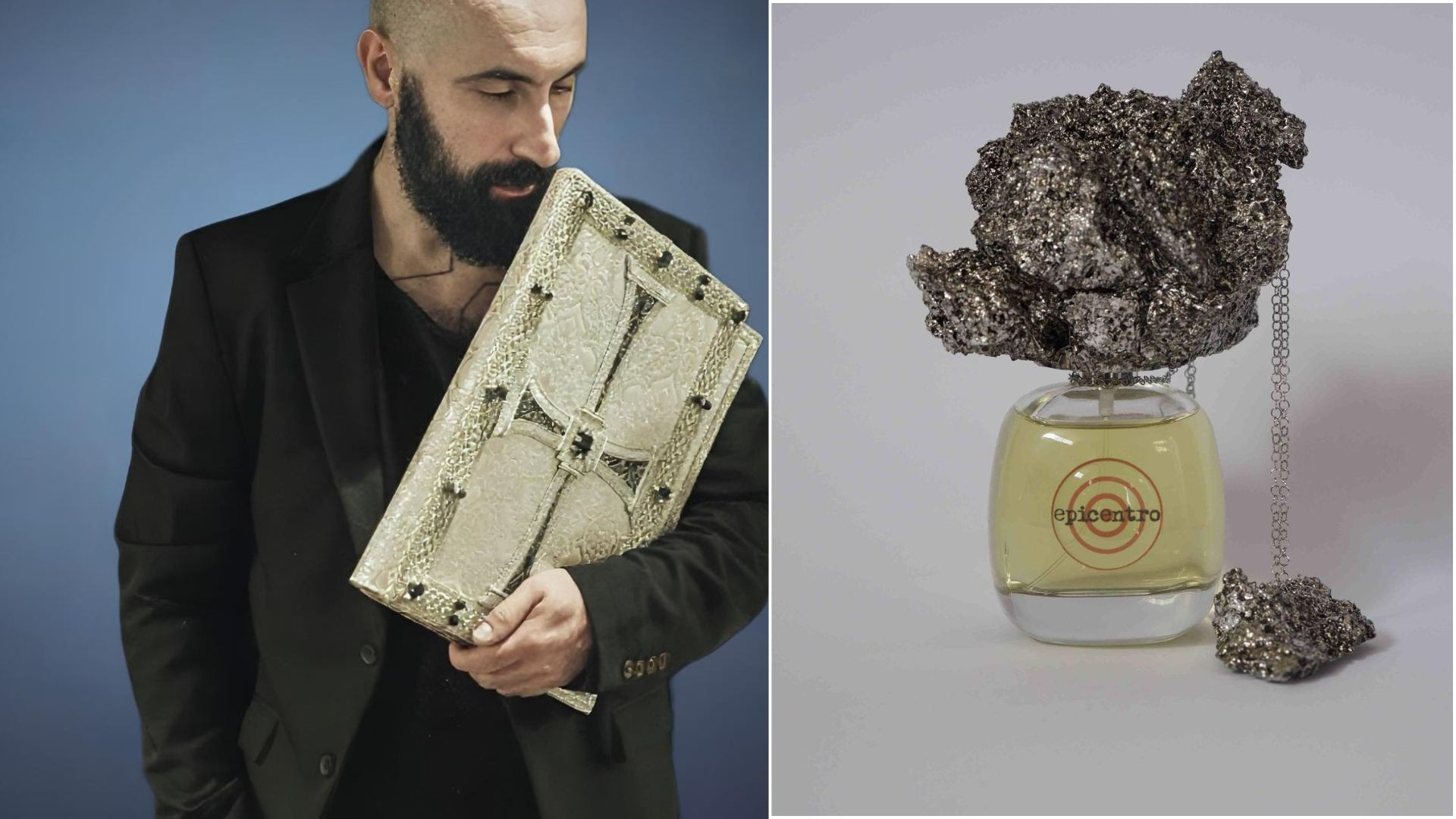 EPICENTRO non è solo un profumo, ma un’opera sensoriale che traduce il dolore in bellezza: il flacone poggia su una base che simula le vibrazioni del terremoto e il tappo riproduce un frammento autentico delle macerie del municipio di Bolognola, raccolto dallo stesso artista durante la sua prima visita.