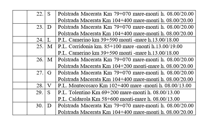 Martedì 25 novembre doppia postazione: Corridonia (km 85+100, 13-19) e Camerino (km 39+590, 13-18). Mercoledì 26 novembre Polstrada a Macerata (km 79+070 e 104+200, 8-20).