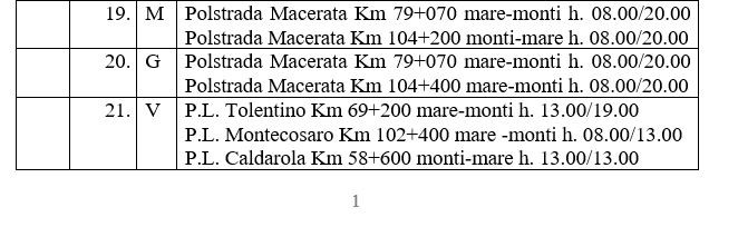Mercoledì 5 novembre doppio controllo della polizia locale: al mattino a Montecosaro (km 102+400, direzione monti, 8-13) e al pomeriggio a Corridonia (km 85+100, direzione monti, 13-19). Giovedì 6 novembre Polstrada di nuovo a Macerata (km 79+070 e 104+400, 8-20).