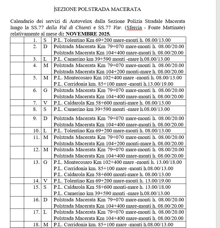 La Prefettura di Macerata ha reso noto il calendario delle postazioni autovelox lungo la superstrada SS77 della Val di Chienti e sulla SS77 Var. (Sfercia – Fonte Mattinate) per tutto il mese di novembre 2025. I controlli saranno effettuati dalla Polizia Stradale di Macerata e dalle Polizie Locali di Tolentino, Caldarola, Camerino, Corridonia e Montecosaro.