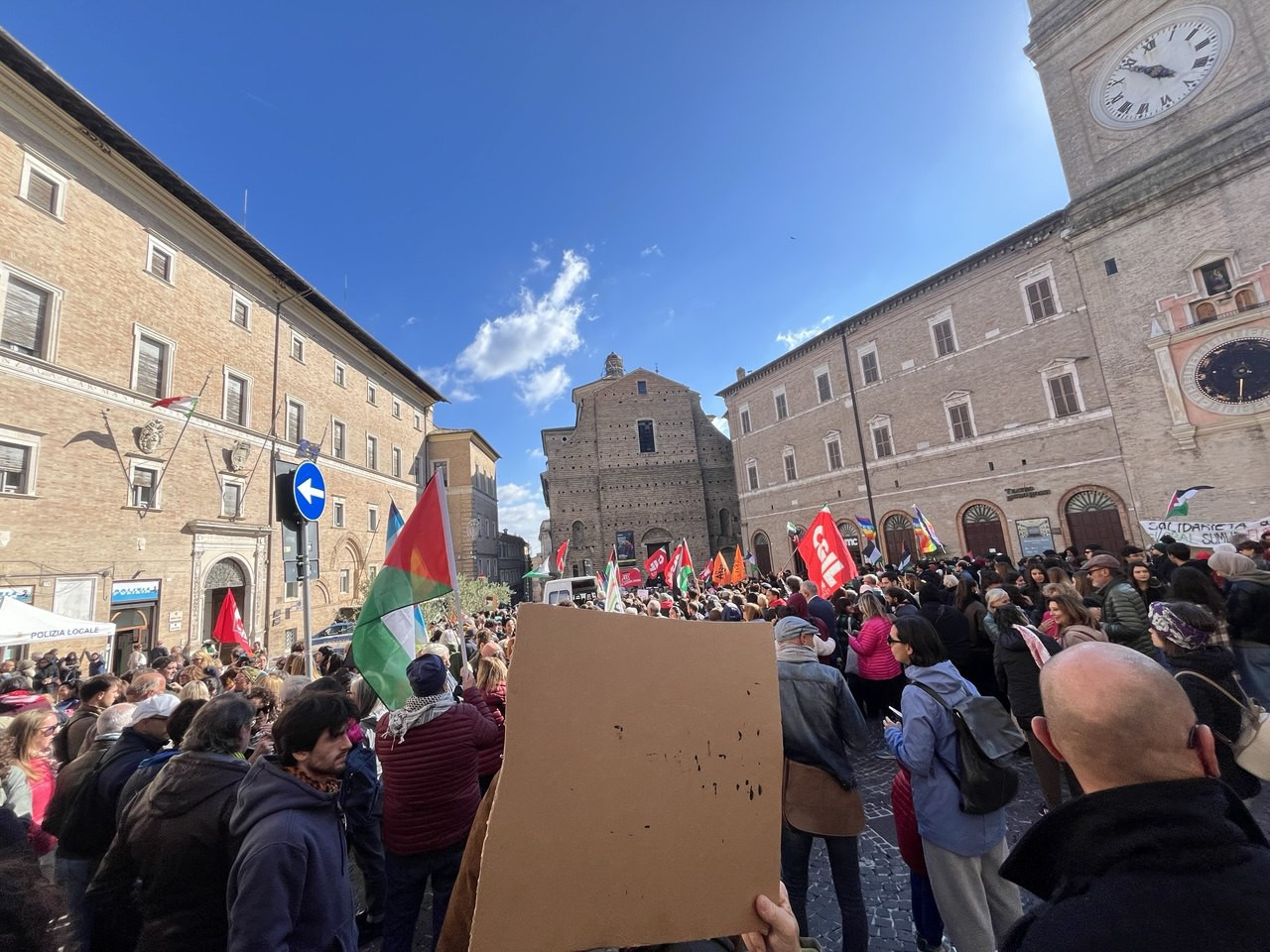 Macerata si è svegliata questa mattina con Piazza della Libertà gremita da centinaia di persone, scese in piazza per partecipare allo sciopero generale indetto dalla CGIL in difesa della Flotilla, dei valori costituzionali e per Gaza. Bandiere rosse del sindacato e vessilli palestinesi hanno colorato la piazza, accompagnati dal coro collettivo “Palestina libera”.
