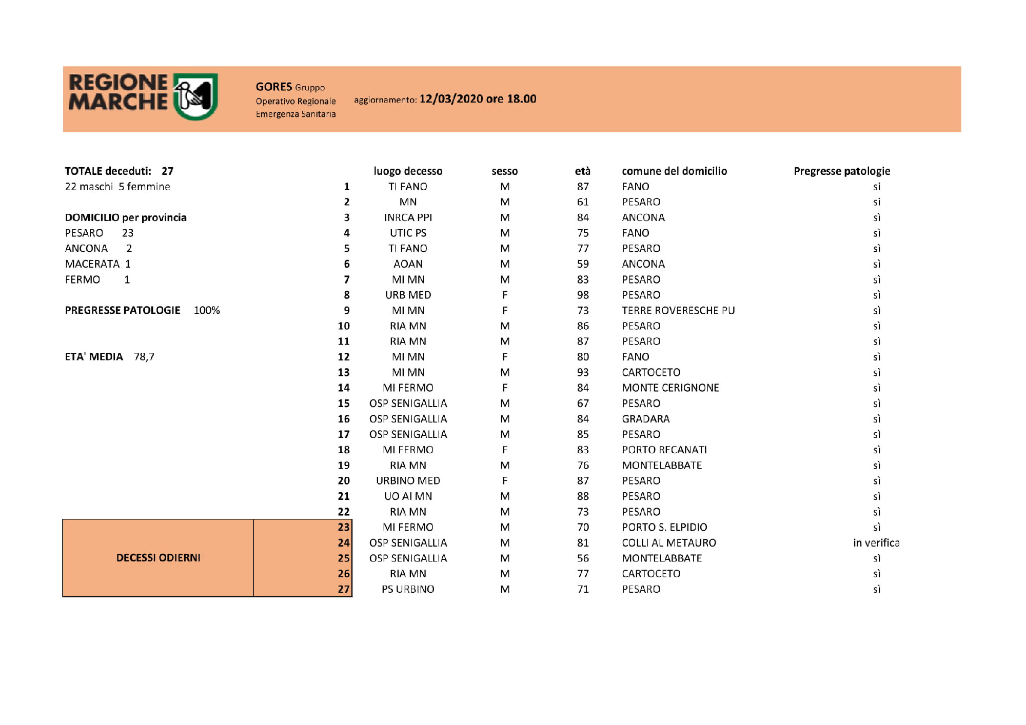 Sono giunti in serata i nuovi aggiornamenti del Gores. Purtroppo anche nella giornata odierna si sono registrati 5 decessi per cause connesse con il Coronavirus. Si tratta di 5 persone, tutti uomini: uno a Fermo 70enne, due a Senigallia di 81 e 56 anni, uno a Marche Nord di 77 anni e uno a Urbino di 71 anni. Salgono a 27 i morti nella Regione. Da sottolineare come praticamente tutti i contagiati deceduti avessero altre patologie pregresse. Sono in corso le verifiche solo sul paziente più anziano deceduto nella giornata di oggi. A comunicarlo è sempre il Gores. L'età media dei morti è scesa da 80,5 a 78.7.