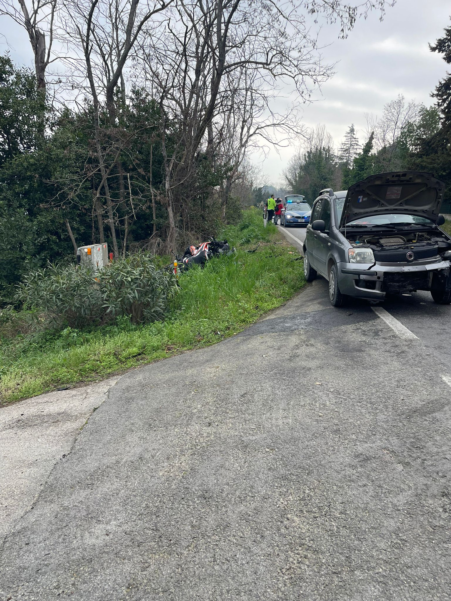 Scontro tra un’auto e una moto nella mattinata di oggi lungo la Strada Provinciale 12, in zona Rotelli, a Macerata.