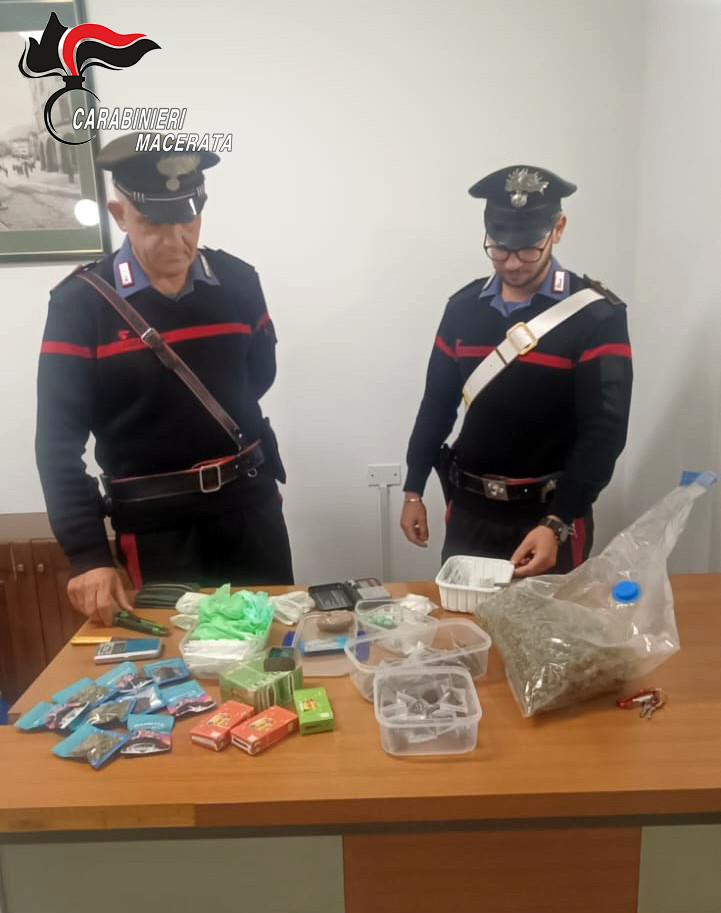 Successivi controlli più approfonditi, compresa una perquisizione domiciliare, hanno permesso di rinvenire nella disponibilità del 29enne di San Severino 400 grammi di marijuana, oltre 800 grammi di hashish, 90 grammi di cocaina e più di 600 euro in contanti, verosimile provento dell’attività di spaccio, oltre a materiale per il confezionamento e bilancini di precisione.