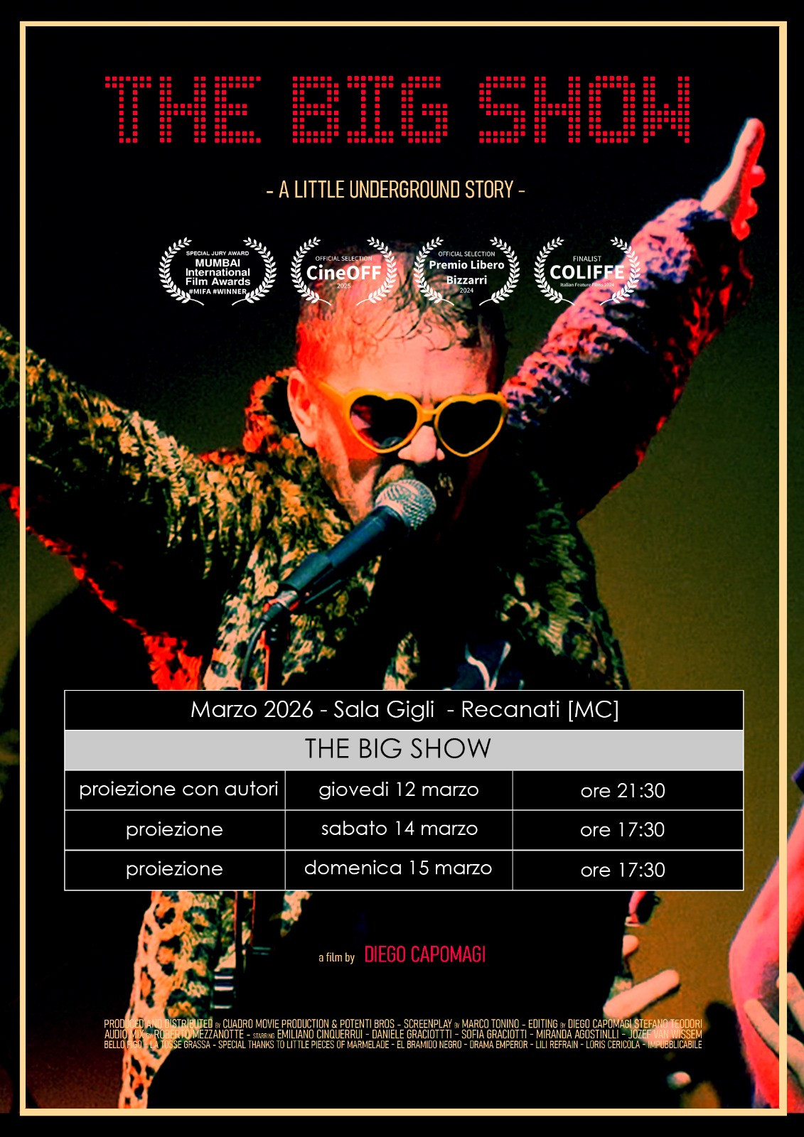 Una storia autentica, indipendente e lontana dai circuiti convenzionali approda sul grande schermo del Cinema Sala Gigli di Recanati. Nel mese di marzo la sala recanatese ospiterà tre proiezioni speciali di “The Big Show – A Little Underground Story”, il film diretto da Diego Capomagi che racconta con uno sguardo sincero e partecipe la faticosa magia della musica indipendente tra Marche e Sicilia.