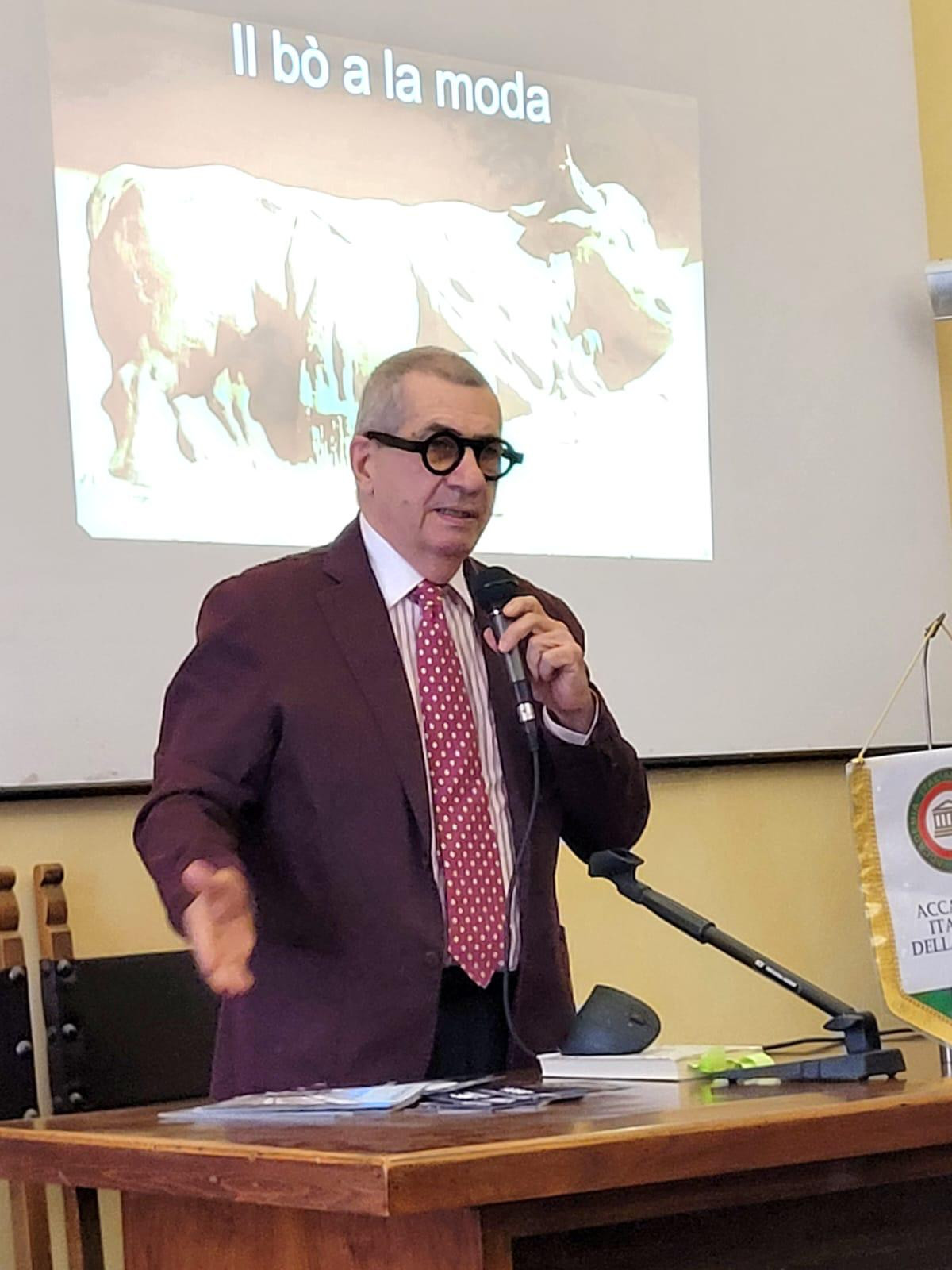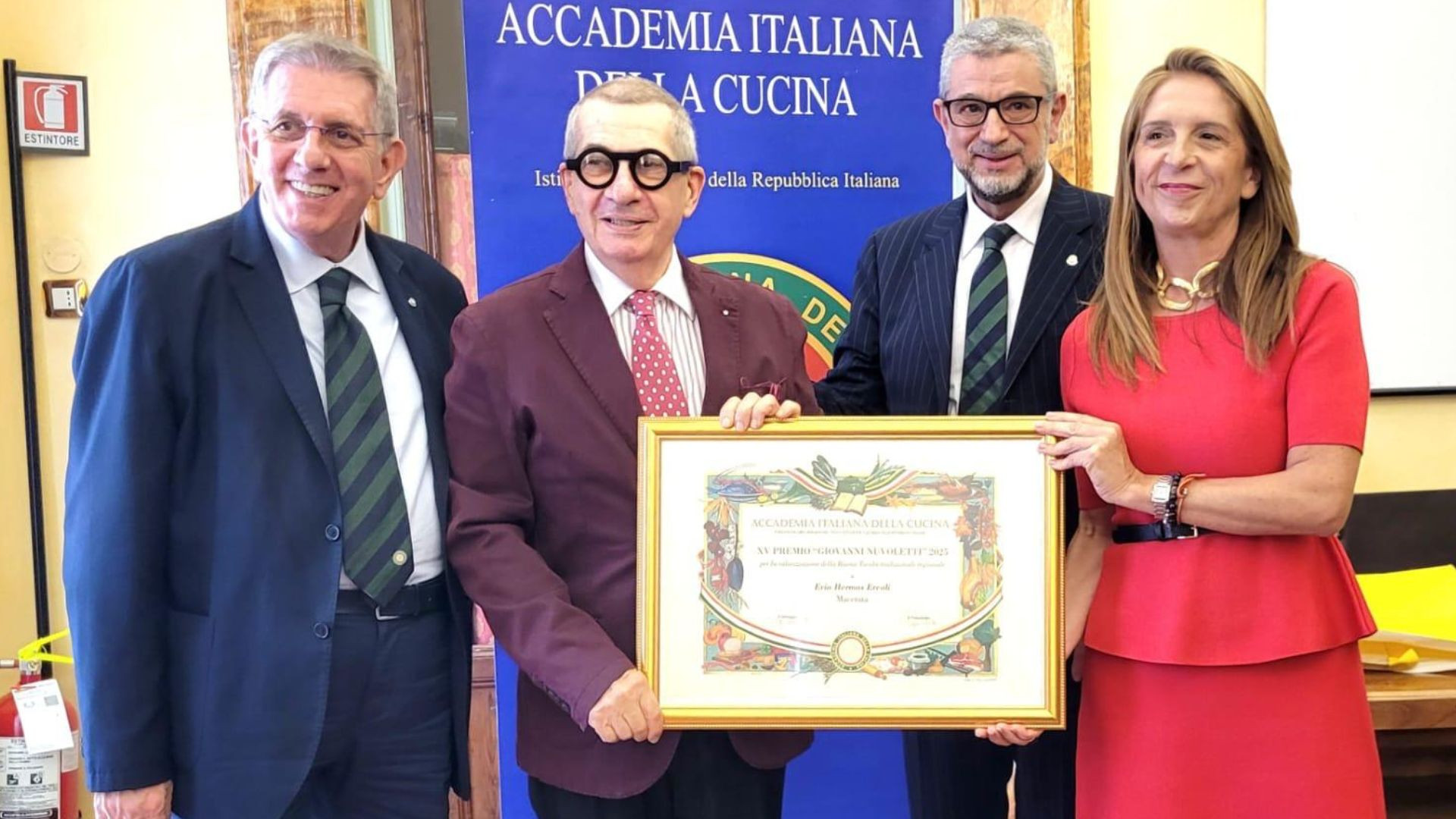 A conclusione del convegno il Comm. Mimmo D’Alessio dell’Accademia Italiana della Cucina e l’assessore alla cultura Katiuscia Cassetta hanno consegnato il prestigioso premio nazionale dell’Accademia “Giovanni Nuvoletti 2025”, per la valorizzazione della Buona Tavola, al Prof. Evio Hermas Ercoli.