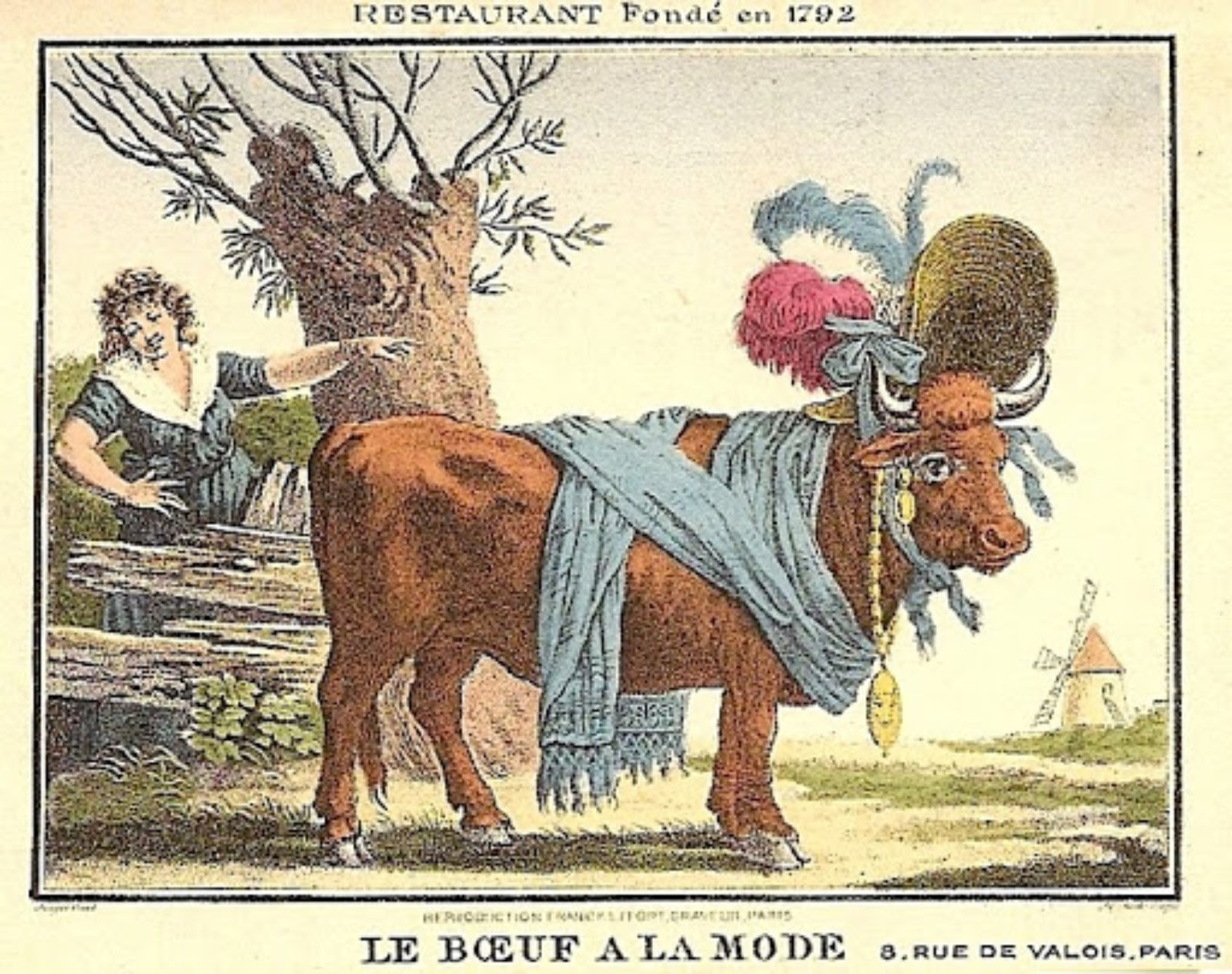Piatto amatissimo da Napoleone, che pur essendo frugale apprezzava le ricette popolari ben fatte. Proprio nel 1792 apre Le Bœuf à la Mode, il primo ristorante “à la carte” di Parigi in Rue de Valois, vicino al Palais-Royal, con un elemento scenografico molto importante: l’insegna, che rappresentava un bœuf “vestito” con châle, toque a piume e abiti alla moda.