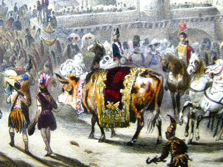 La sfilata del Bœuf Gras arriva perfino in Italia e fa da sfondo agli ultimi momenti di Violetta Valéry ne La Traviata di Giuseppe Verdi, dove cori e fanfare evocano la gioia carnevalesca: “Largo al quadrupede”.