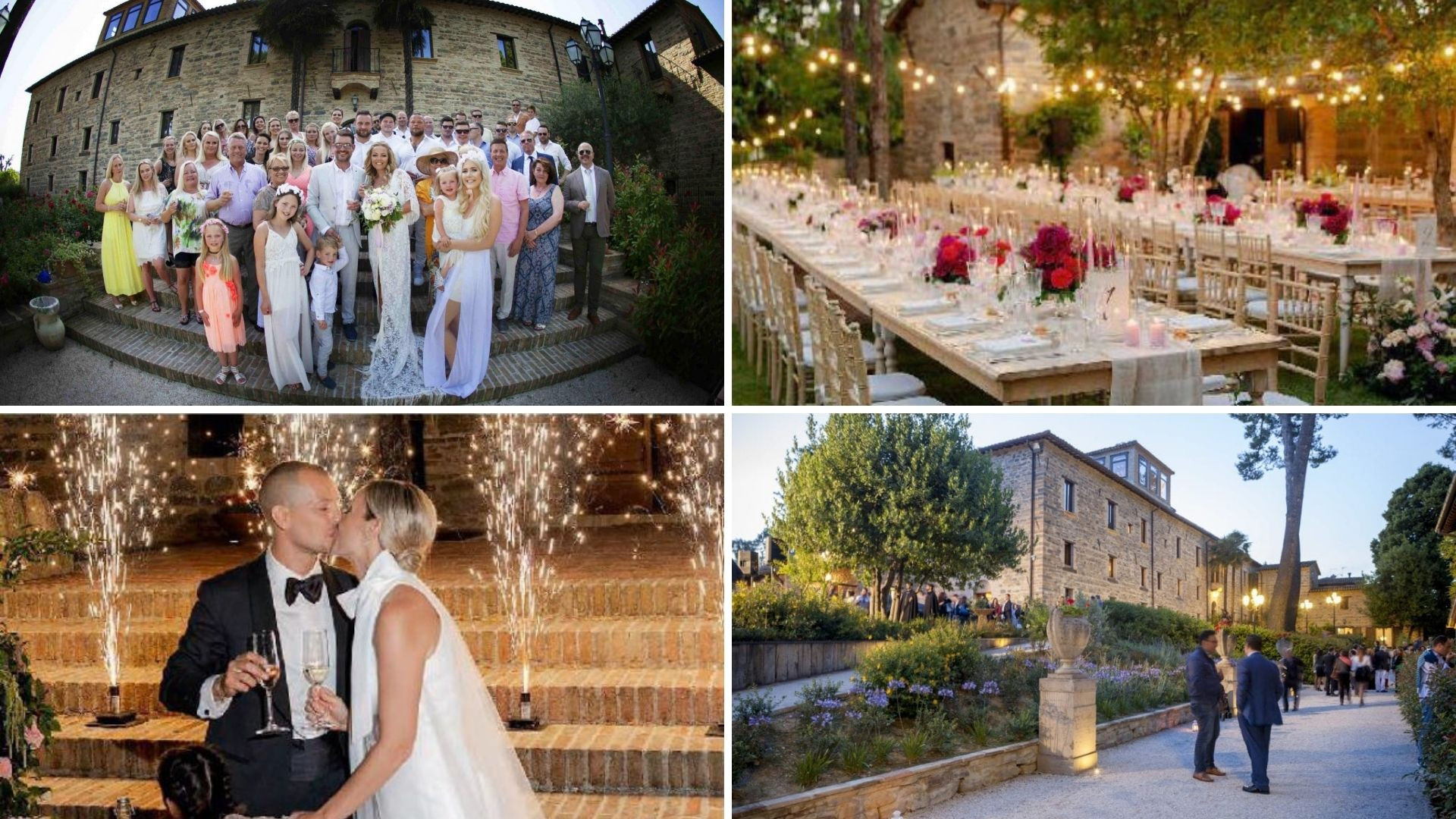 L'evento, curato dalla wedding planner Tatiana Tabanelli, ha esaltato il lusso e l'eleganza. L'allestimento ha previsto lunghi tavoli imperiali in legno decapato bianco, splendidamente decorati con composizioni floreali nelle sfumature del rosa, fucsia e verde lime. Il momento culminante, il taglio della torta, è stato accompagnato da fontane di luce e spettacolari fuochi d'artificio. Gli abiti scelti dalla sposa hanno enfatizzato l’eleganza: una silhouette a sirena firmata Elie Saab per la cerimonia e un mini abito di Viktor & Rolf per il party.