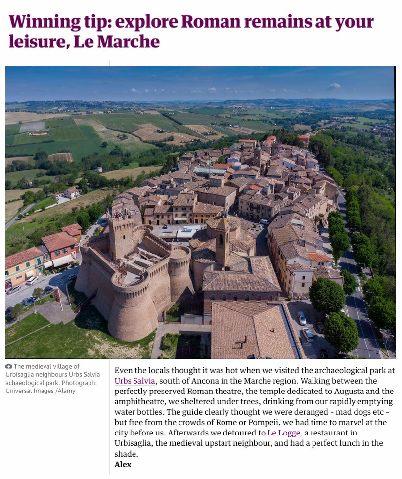 Il pezzo descrive l'emozione provata da un viaggiatore inglese nel visitare il Parco Archeologico di Urbs Salvia: "Camminando tra il teatro romano perfettamente conservato, il tempio dedicato ad Augusta e l'anfiteatro, ci siamo riparati sotto gli alberi, bevendo dalle nostre borracce che si svuotavano rapidamente. La guida pensava chiaramente che fossimo fuori di testa, ma liberi dalle folle di Roma o Pompei, abbiamo avuto il tempo di ammirare la città davanti a noi".
