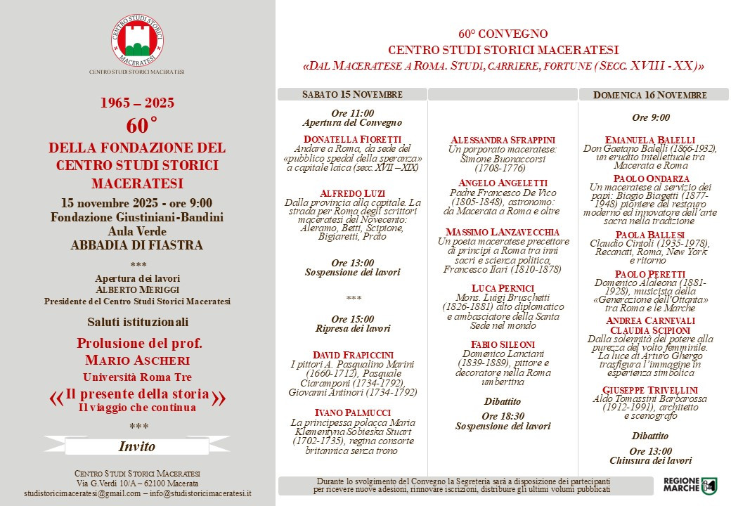 Il 15 e 16 novembre 2025 si terrà presso la Sala Verde dell’Abbadia di Fiastra il 60° convegno del Centro Studi Storici Maceratesi sul tema: "Dal Maceratese a Roma. Studi, carriere, fortune (Secc. XVIII-XX)".