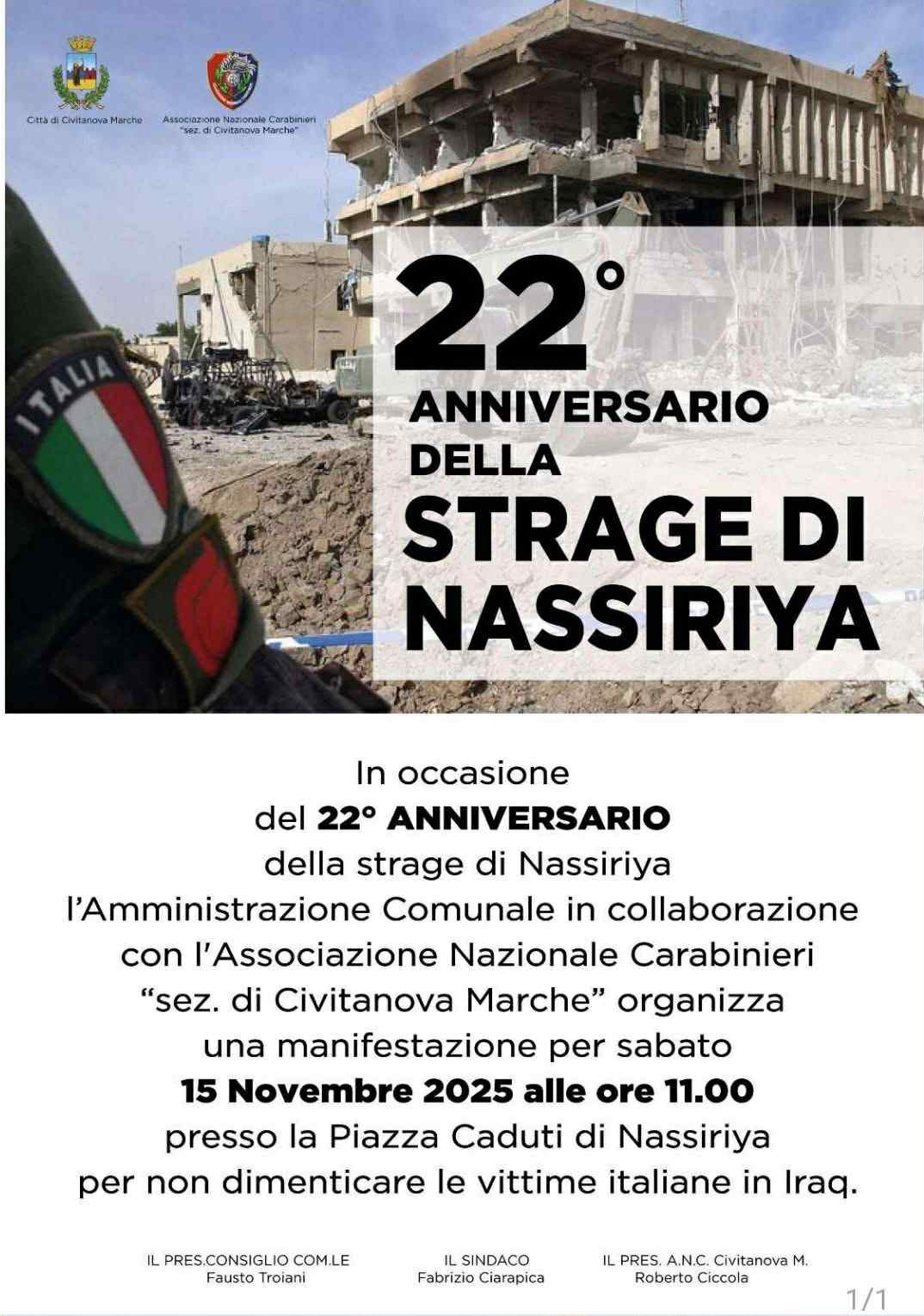 Le autorità civili e militari esprimeranno l’omaggio alla memoria delle vittime italiane in Iraq, deponendo una corona d’alloro sul monumento presente nella piazza dedicata. Oltre alle massime autorità civili della città di Civitanova Marche, saranno presenti anche le massime autorità militari, tra cui il Generale Tito Baldo Honorati, Ispettore regionale ANC, il Colonnello Raffaele Ruocco, Comandante provinciale dei Carabinieri di Macerata e la Signora Giovanna Paolone Piermanni, portatrice della Medaglia d’Oro al Valor Militare alla Memoria.