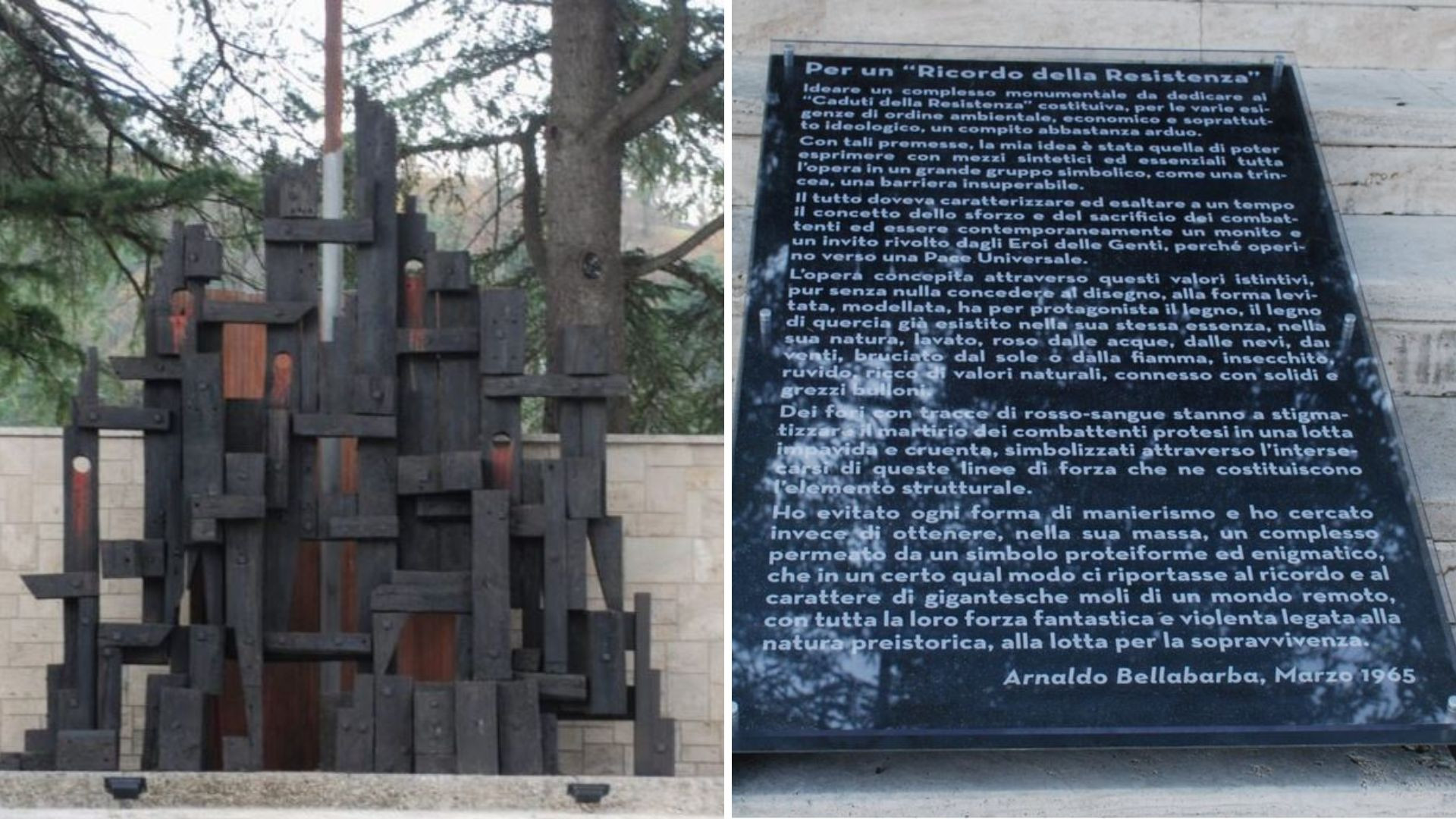 Realizzato nel 1965 con robuste traverse di quercia collegate da bulloni in ferro, il monumento si inserisce in un più ampio complesso che comprende dieci gradini e alzate murarie in travertino. La struttura si distingue per la sua forte carica emotiva: i grossi fori nella metà superiore lasciano intravedere strisce di smalto rosso, simbolo del sangue e delle ferite della guerra. Una lastra di marmo a destra ricorda i nomi dei caduti, mentre a sinistra campeggia una scritta in ferro dedicata al ventennale della Resistenza.