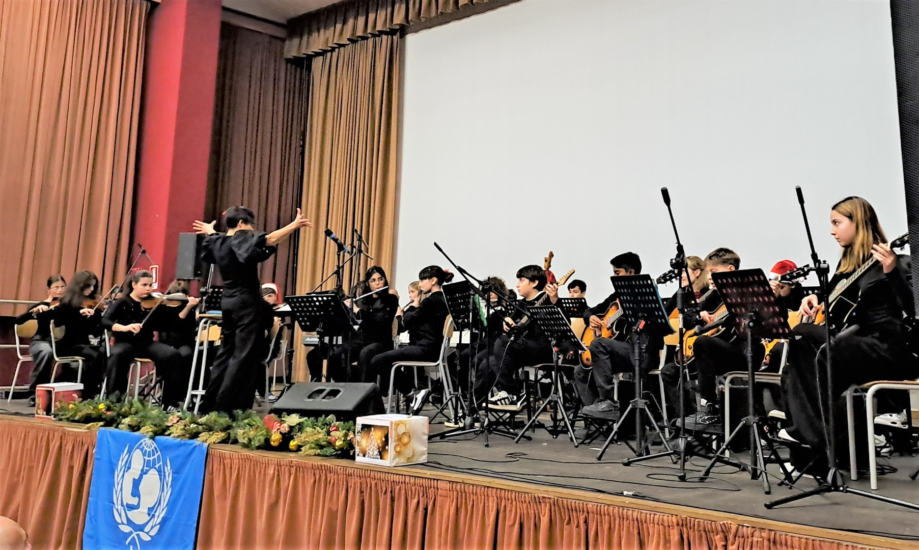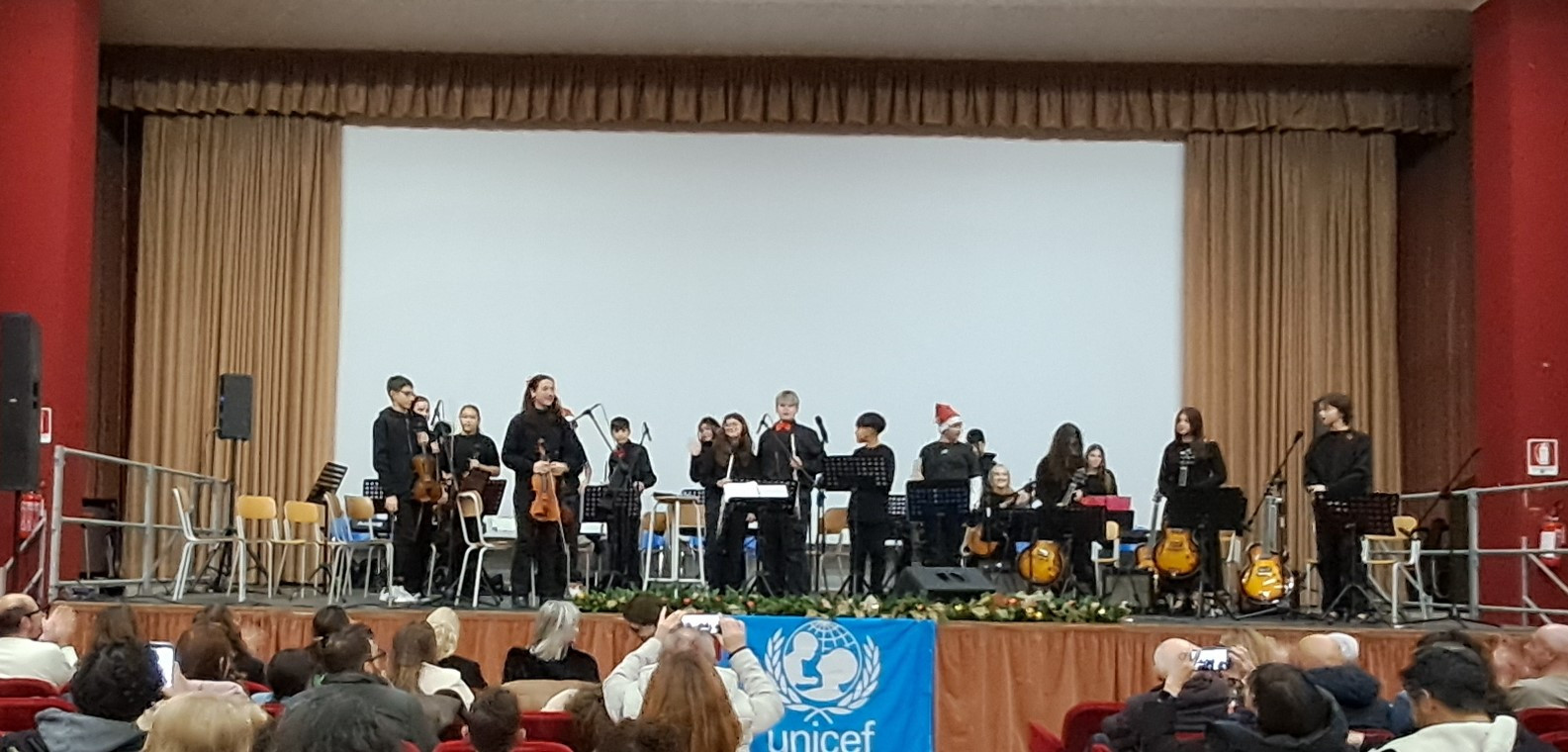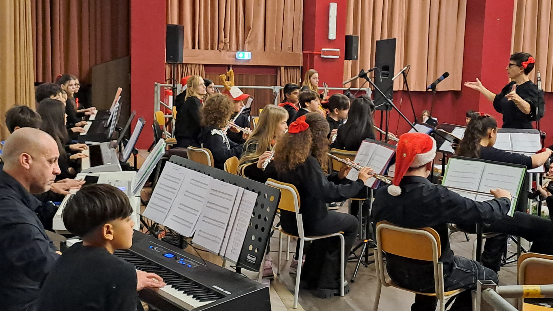 Con le classi seconde la musica ha cambiato volto: Marta Montanari ad un certo punto ha lasciato il palco, affidando ai ragazzi, ormai capaci di guidarsi e respirare insieme attraverso ascolto reciproco e intesa musicale, brani della tradizione natalizia e pagine più moderne, dall’“Inno alla gioia” di Beethoven a “La bella e la bestia”, fino a “Feliz Navidad” e un arrangiamento di “We will rock you” dei Queen.