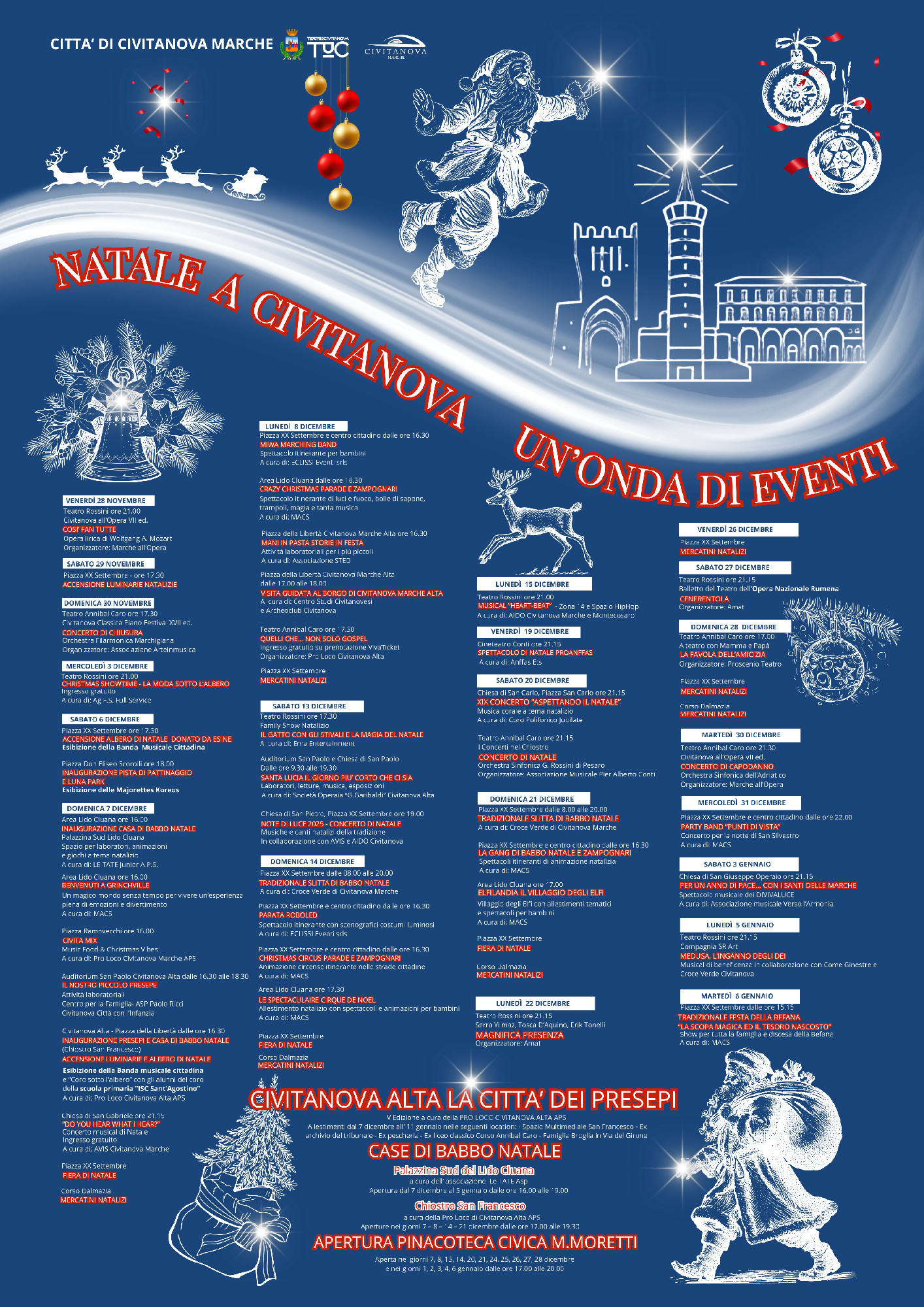 Tra le tante novità, il Capodanno in piazza XX Settembre, del 31 dicembre a partire dalle ore 22 insieme alla Party Band “Punti di Vista”. Nel mezzo mercatini, fiera di Natale, luminarie, spettacoli teatrali e musicali, performance itineranti, concerti gospel, presepi artistici, laboratori, itinerari culturali, danze, luna park, pista sul ghiaccio, animazioni, mostre e la meraviglia delle Case di Babbo Natale.