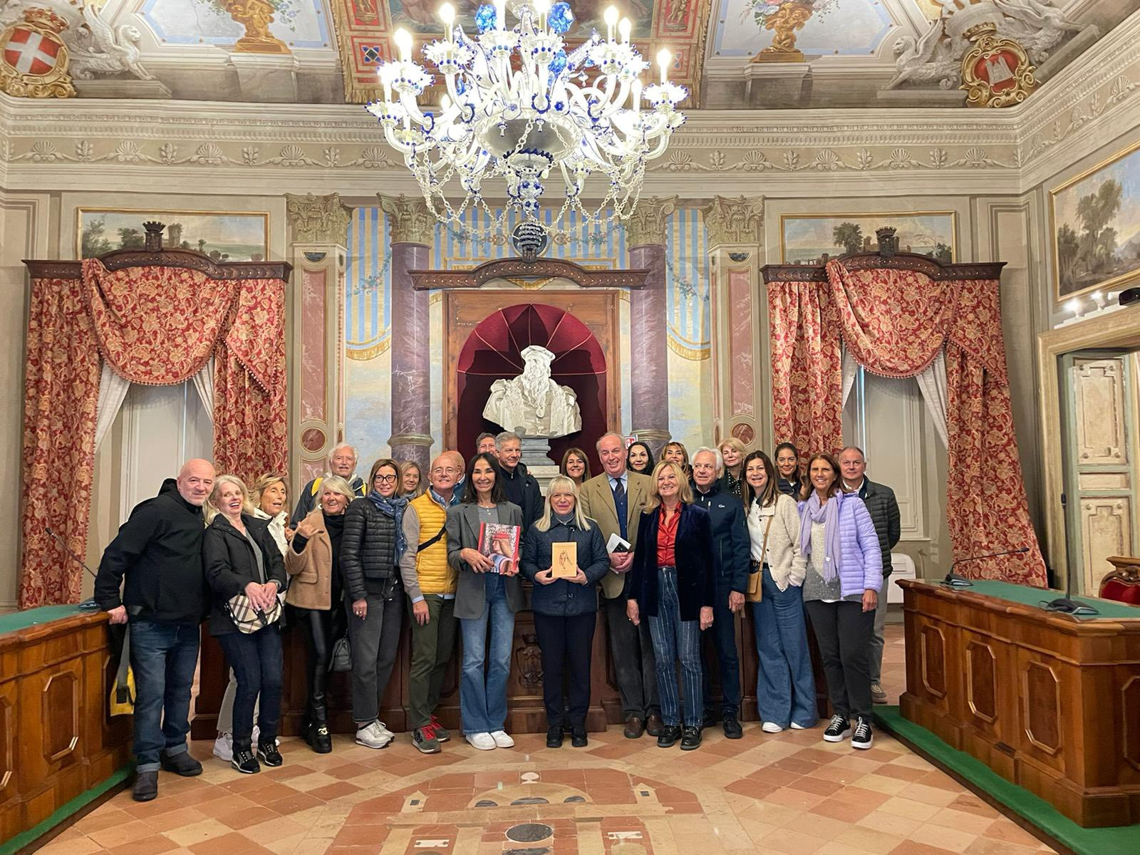Nel pomeriggio la comitiva è stata ricevuta nella Sala del Consiglio del Palazzo Comunale dal sindaco di San Severino Marche, Rosa Piermattei, che ha portato il saluto dell’Amministrazione e introdotto il tour alla mostra “Rinascimento Marchigiano”, un’esposizione di grande prestigio, ospitata nel piano nobile del Municipio, che mette in luce capolavori del periodo. La mostra, curata da Stefano Papetti e Pierluigi Moriconi e allestita da Anci Marche e Pio Sodalizio dei Piceni con il patrocinio del Comune, resterà aperta fino all’Epifania 2026 e rappresenta un’occasione imperdibile per ammirare tesori d’arte e documenti storici di eccezionale valore offrendo una panoramica completa sulla fioritura artistica e culturale delle Marche tra il Quattrocento e il Cinquecento.