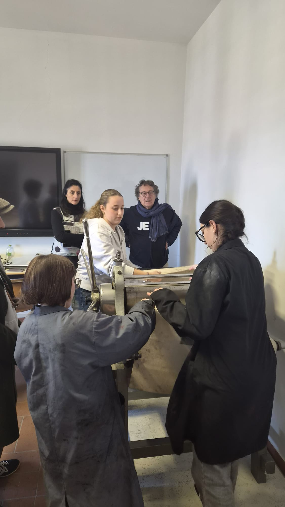 L’incontro si è poi trasformato in una visita immersiva: accompagnato da una delegazione di giovani studentesse e dai membri della compagnia – tra cui la stessa Civale, Ermenegildo Marciante ed Elisabetta Mandalari – Iacchetti si è recato personalmente presso i laboratori della Stamperia.