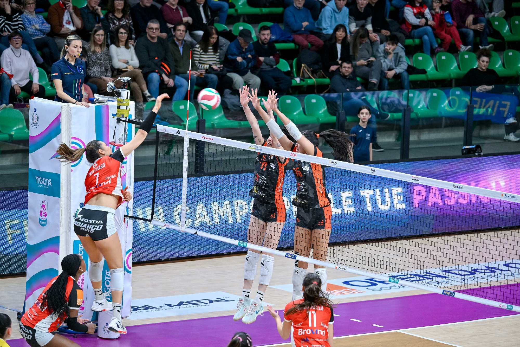 Coach Lionetti schiera Bonelli-Decortes, Mazzon-Crawford, Kokkonen-Kockarevic, Caforio libero. Coach Salvagni mette in campo Signorile-Diop, Keene-Cecconello, Pritchard-Pucelj, Bardaro libero.