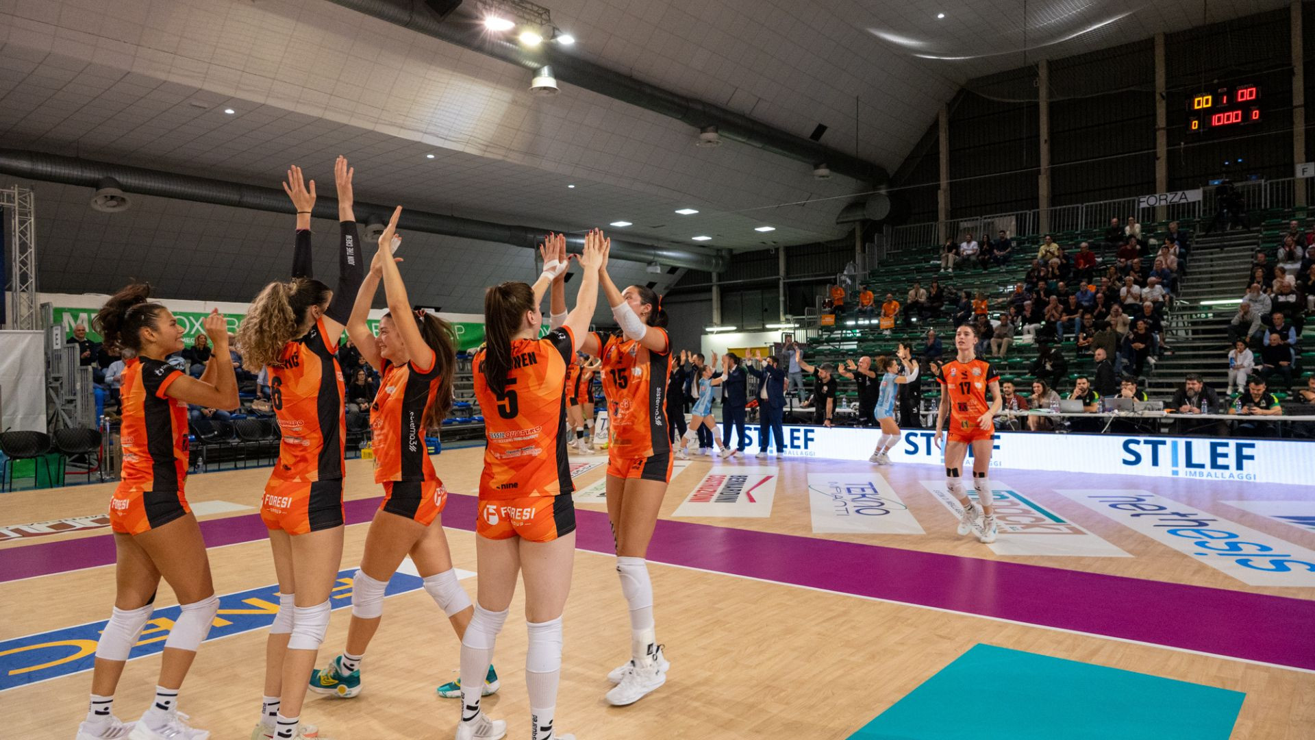 Coach Lionetti parte con Bonelli-Decortes, Crawford-Mazzon (Clothier è ferma precauzionalmente dopo un problema al ginocchio ad inizio riscaldamento), Kokkonen-Kockarevic, Caforio libero. Coach Pistola schiera Bartolucci-Bici, Candi-Butigan, Omoruyi-Giovannini, De Bortoli libero.