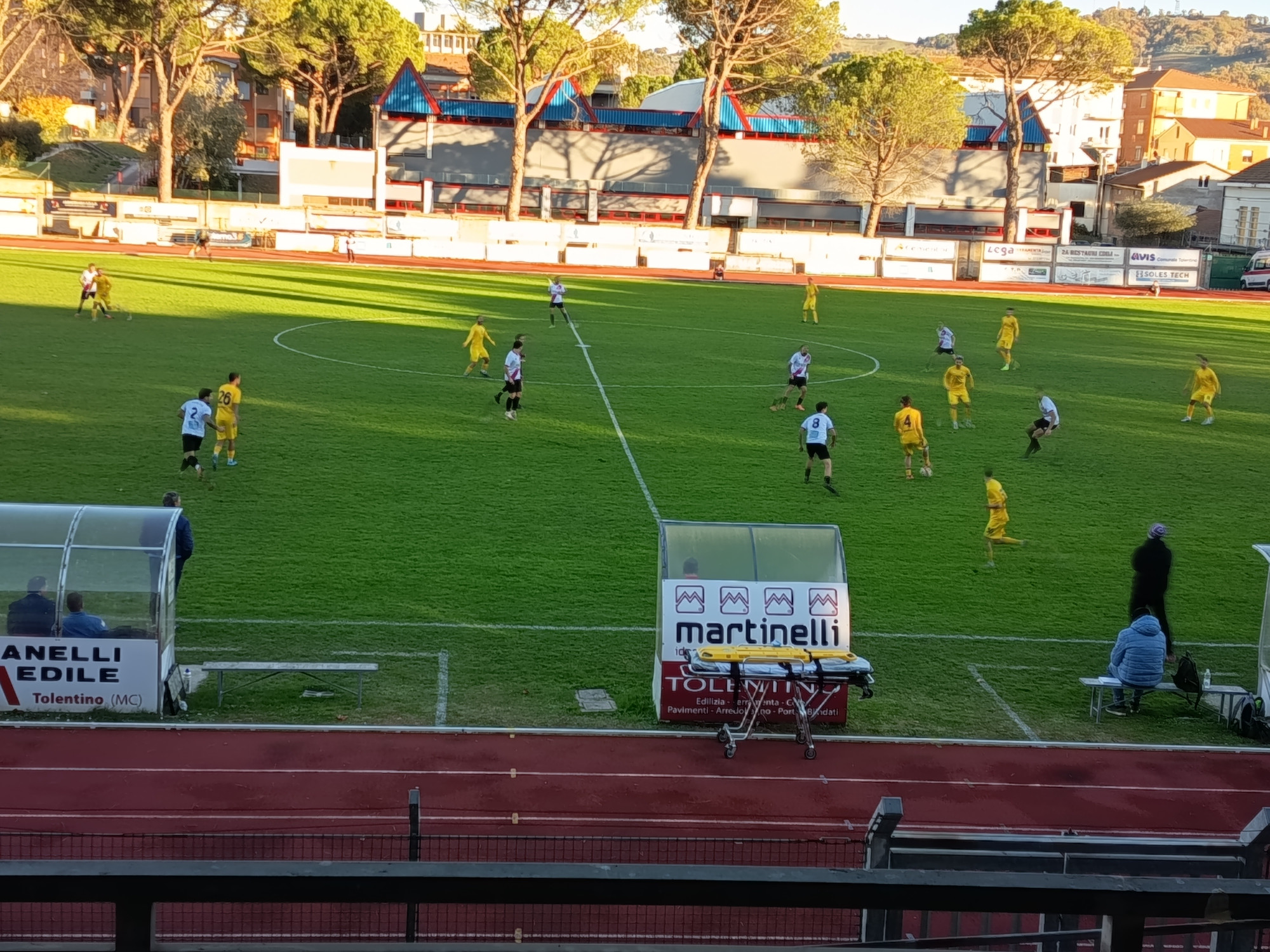 Stavolta la squadra di Gentilini accusa il colpo. Una fiammata arriva al 29’ con il diagonale strozzato di Cicarevic, da ottima posizione. Moscati è imprendile. Al 36' Ruano, nel tentativo di placcarlo, si guadagna l'ammonizione e pure un infortunio. Cambio obbligato con Morelli che fa il suo ingresso sul terreno. Sulla punizione susseguente il Tolentino cala il tris. La parabola di Tizi è splendida e beffa di nuovo Valente.