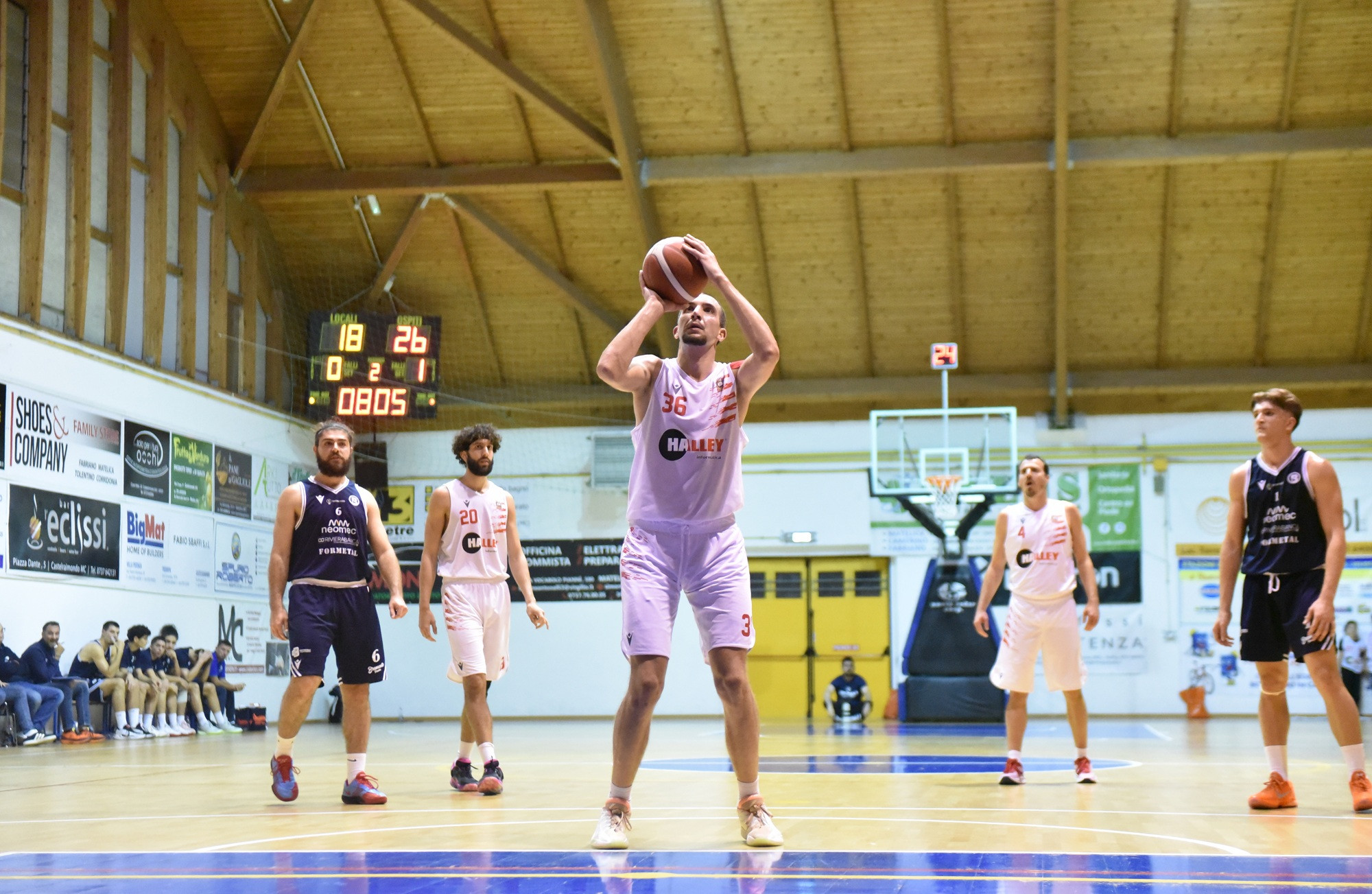 Mariani ferma saggiamente Cornis prima che possa tentare il canestro dalla lunga, lasciandogli due liberi con 1,5” da giocare. Il classe 2007 realizza il primo e, nonostante le indicazioni della panchina, segna anche il secondo, riportando i suoi a -1 (77-76) ma ridando la palla alla Halley. Timeout per coach Trullo, rimessa in zona d’attacco biancorossa: Mariani riceve, Panichi prova a fare fallo ma l’arbitro non fischia.