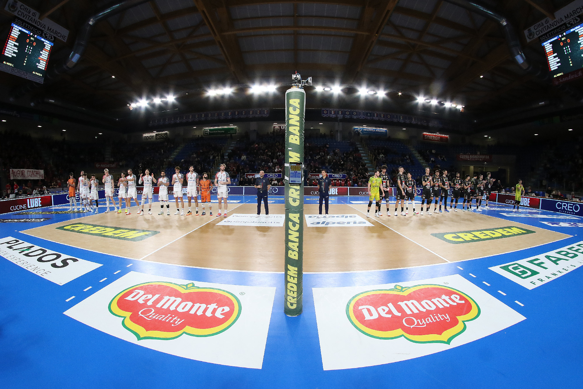 Lube in campo con Boninfante in cabina di regia e Kukartsev opposto, Loeppky e Bottolo di banda, al centro Gargiulo e Podrascanin, Balaso libero. Ospiti schierati con in palleggiatore Cachopa in diagonale con l’opposto Reggers, laterali Otsuka e Recine, centrali Caneschi e Di Martino, libero Catania.