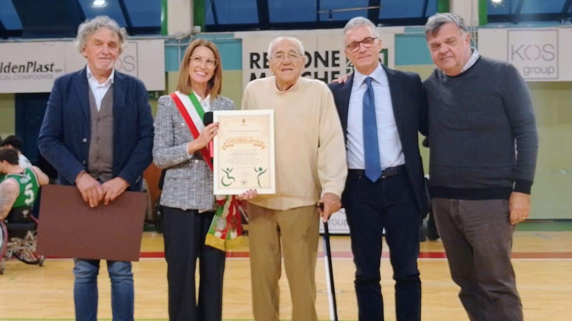 Un lungo applauso ha accompagnato la consegna della Benemerenza per Meriti Sportivi al dottor Mario Ferraresi, figura storica dello sport paralimpico marchigiano, insignito dal comune di Potenza Picena per oltre tre decenni di impegno alla guida dell’Asd Santo Stefano Sport.