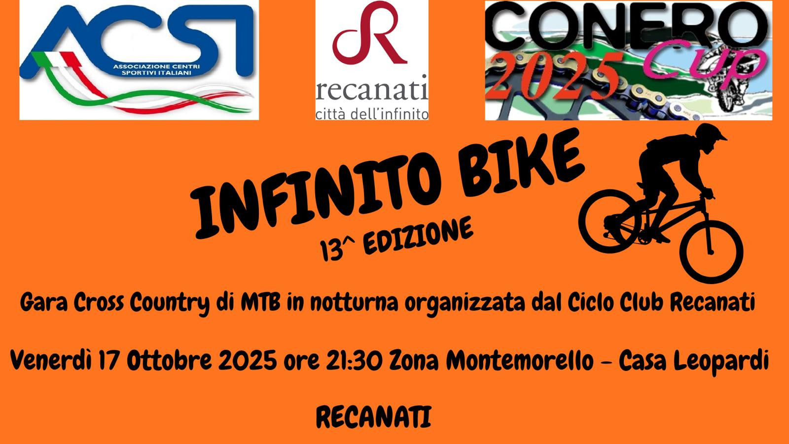 Si comincia venerdì 17 ottobre con la 13ª edizione della Infinito Bike, la gara di mountain bike ambientata nello spettacolare scenario del Colle dell’Infinito e del quartiere Montemorello. Un percorso di tre chilometri, tra vicoli, sterrato e brevi tratti asfaltati, darà vita a una prova di Cross Country intensa e spettacolare. La Infinito Bike sarà anche la prova conclusiva della Conero Cup, la storica challenge che da oltre venticinque anni promuove la mountain bike nelle Marche. La partenza è fissata per le 21.30, mentre per i partecipanti è previsto un ricco pacco gara, che conterrà anche una maglietta ricordo di alta qualità riservata ai primi cinquanta iscritti.