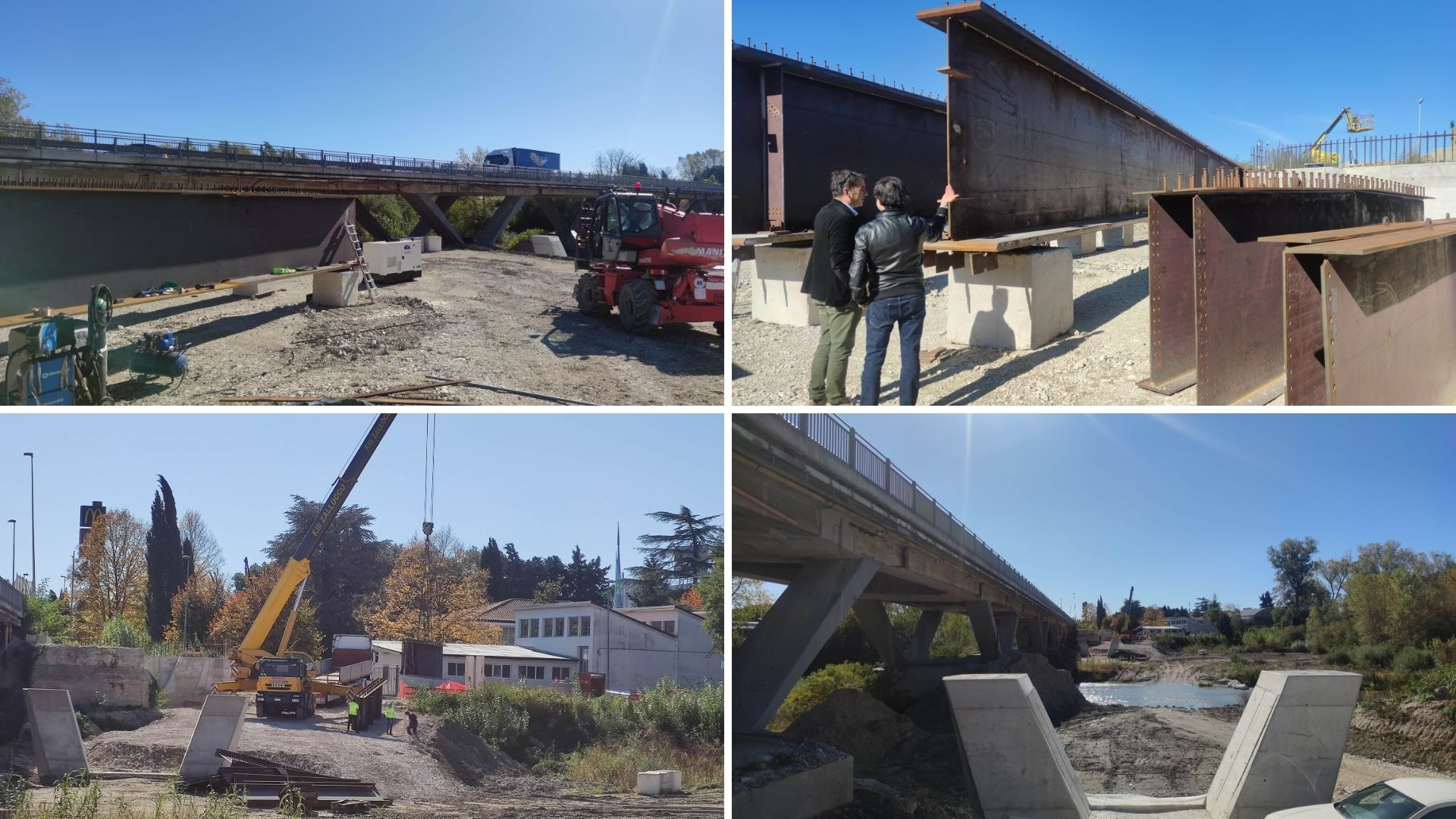 Terminata la costruzione dei piloni è iniziato in questi giorni l'assemblamento dei conci in acciaio delle travi principali che costituiranno il nuovo ponte sul Chienti a Piediripa. Ieri mattina il sopralluogo del presidente della Provincia, Sandro Parcaroli, del vicepresidente Luca Buldorini e del dirigente del settore viabilità, Matteo Giaccaglia, per verificare come sta procedendo l’opera, iniziata il 30 gennaio scorso.